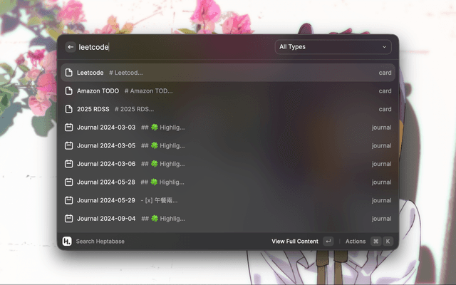 • Search Heptabase - Semantic search across cards, PDFs, journals, and highlights