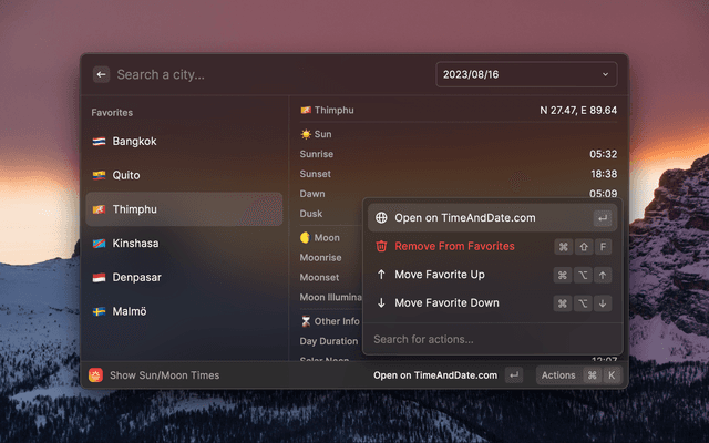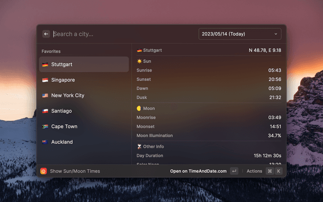 Show info for sun and moon for any city in the World.