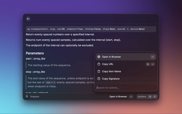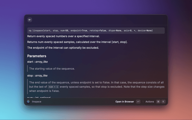 A Raycast extension that lets you search the NumPy API reference and preview detailed documentation without leaving Raycast. Results include function signatures, descriptions, parameters, and return values, with quick actions to open the official docs in your browser.