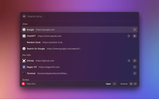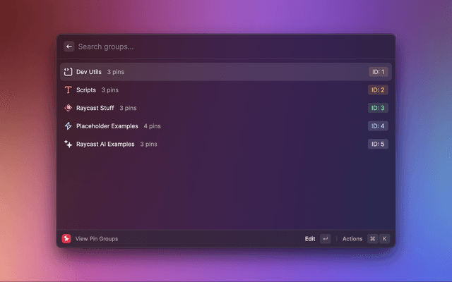 • View pins and groups in the menu bar or within Raycast
