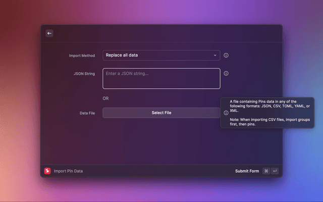 • Export Pin Data - Copies a JSON representation of your pins and groups to the clipboard