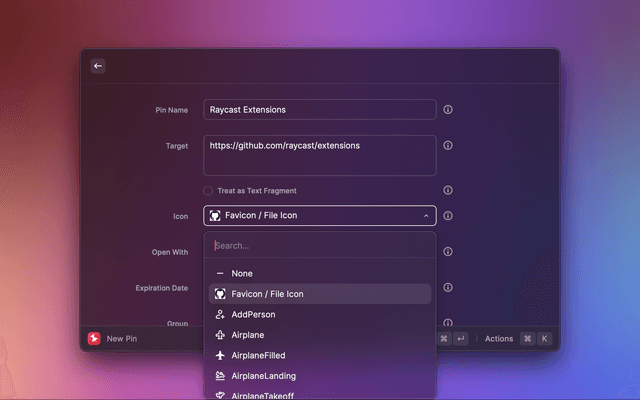 A Raycast extension for pinning anything with a path or URL to the menu bar, with support for pinning Terminal commands as well. Quickly navigate to your favorite sites, folders, and files, conveniently execute Terminal commands, and intuitively manage pins and groups from within Raycast.