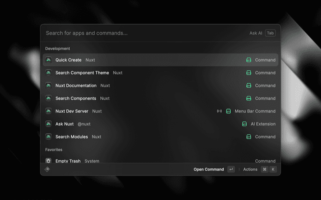 Nuxt for Raycast is the ultimate productivity booster for Nuxt developers. Access documentation, explore the entire Nuxt ecosystem, and enhance your development workflow without ever leaving your editor.