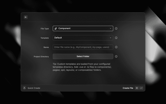 - Create files instantly (Component, Page, API Route, Composable)