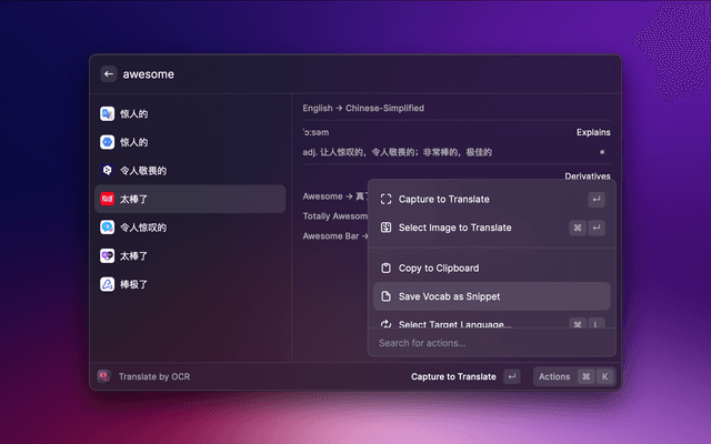 Translate words or sentences, support 36 languages, OCR, history record and translating into multiple languages at the same time.