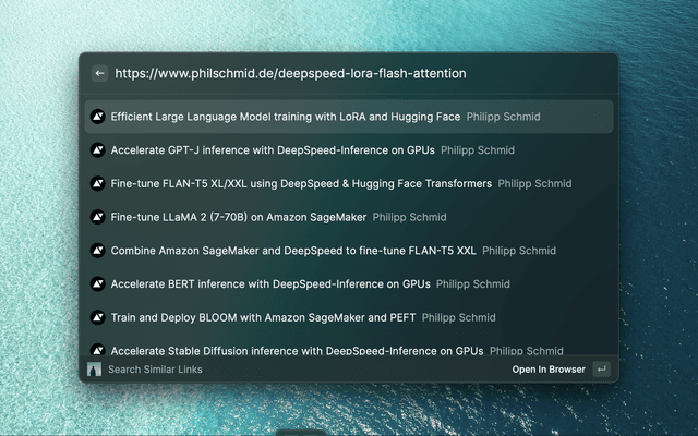 Open the Raycast window and trigger "Search Similar". Paste the URL link.
