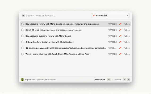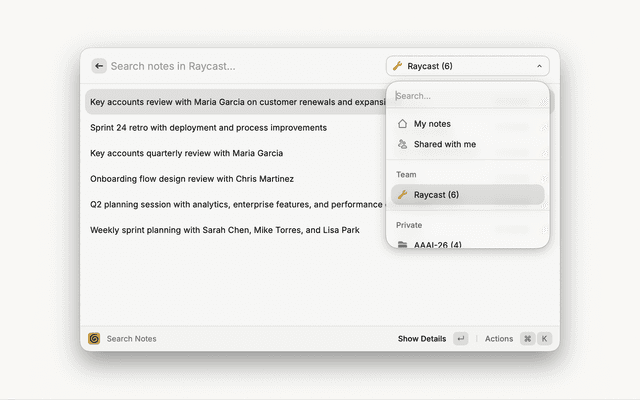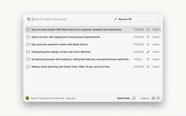 • Raycast must have access to your ~/Library/Application Support/Granola folder (macOS) or %APPDATA%\Granola folder (Windows)