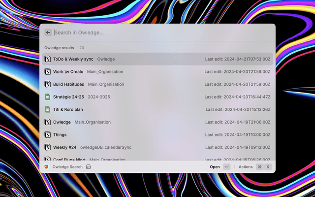 Access Notion, Figma, Github, Miro, Jira and way more in a single crazy fast search. | Set your Owledge workspace at: https://search.owledge.app | Documentation available at: https://owledge.notion.site/Use-Raycast-s-extension-75b90b8501014bb7b8c8c901a9fcc552?pvs=74