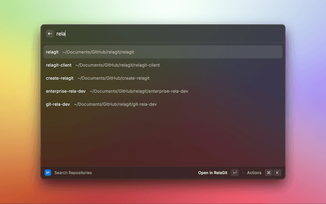 The RelaGit extension for raycast allows you to view and search your RelaGit repositories, and manage your RelaGit workflows.