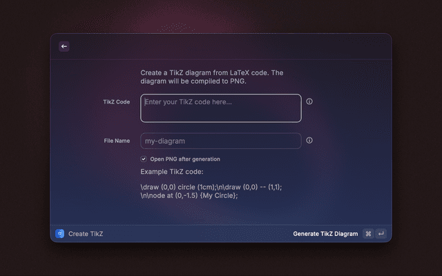 • 🤖 AI Tool Integration: Generate TikZ diagrams directly from Raycast AI chat