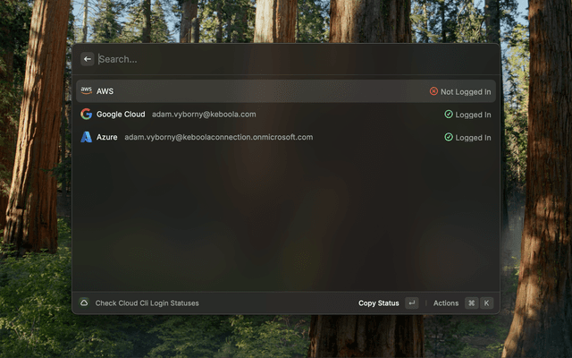 This extension provides a quick overview of your login status across multiple cloud providers directly from Raycast. It's particularly useful when working on cloud-agnostic projects or managing multi-cloud infrastructure.