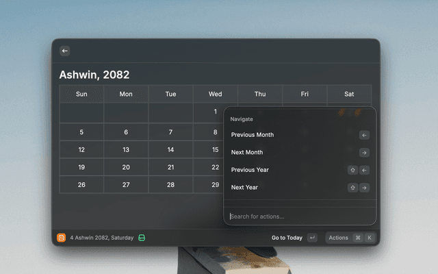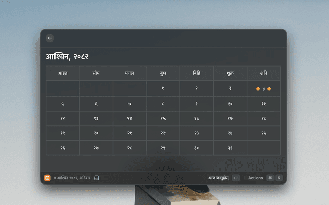 View the Nepali month calendar directly within Raycast. This extension allows you to quickly check dates, navigate through months and years, and view the calendar in either English or Nepali.