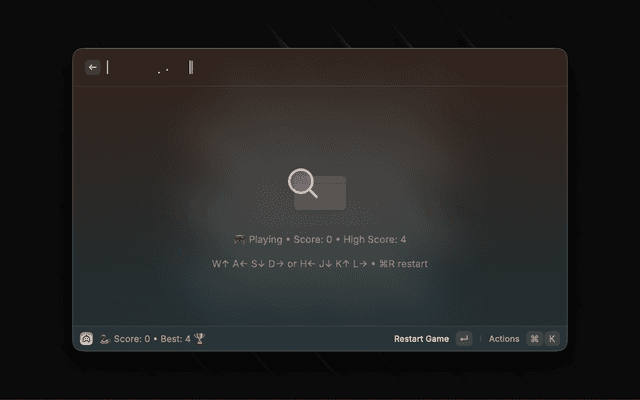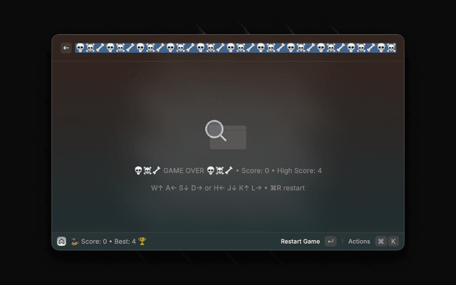 Launch the classic Snake game in your Raycast window. Use keyboard controls to navigate:
