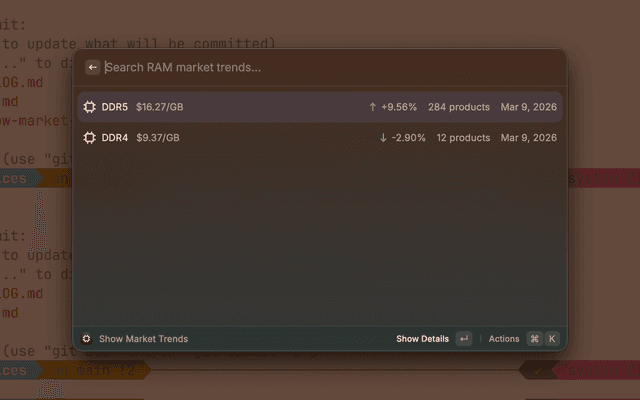 Show Market Trends shows DDR4 and DDR5 pricing in a searchable list.Market Trends Menu Bar shows the latest prices in the Raycast menu bar.Note: The Market Trends Menu Bar command is only available on macOS.
