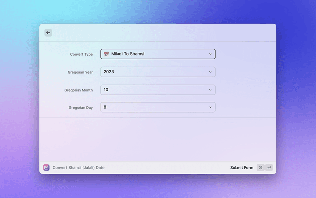 Converts Shamsi (Jalali) calendar dates to/from Gregorian calendar