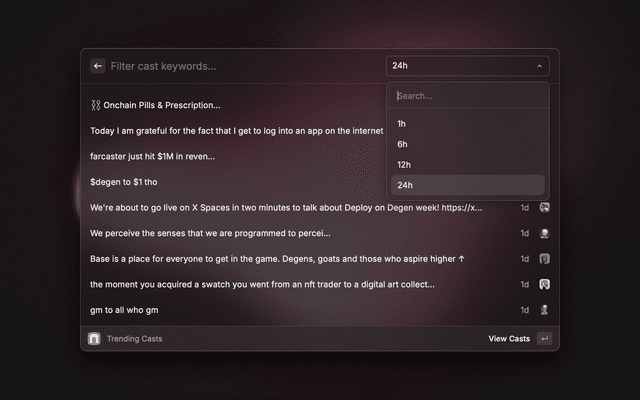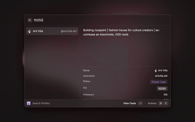 Most comprehensive extension for Farcaster. Search for casts, profiles and more. In order to use this extension, you'll need a Neynar API Key