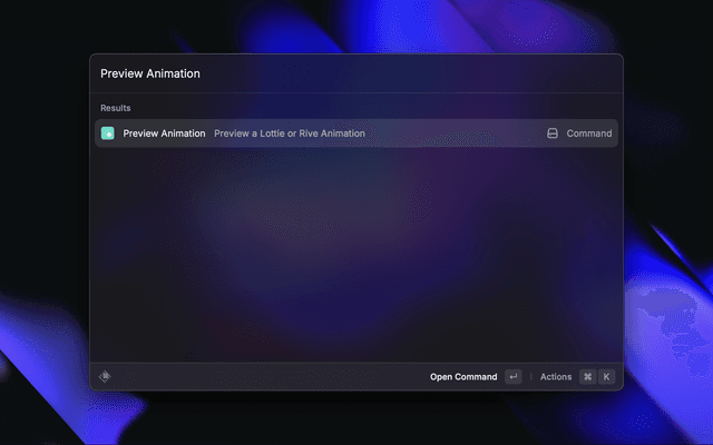 Motion Preview is a Raycast extension that allows you to quickly preview modern animation formats. It supports both Lottie (JSON and dotLottie) and Rive file formats.