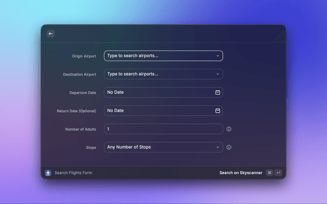 A Raycast extension to quickly search for flights on Skyscanner using natural language.