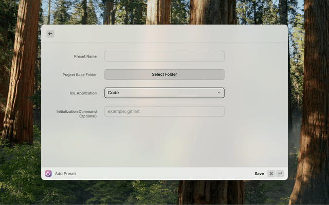 - Create Project Presets: Save your frequently used project folder locations, initialization commands and preferred IDE applications