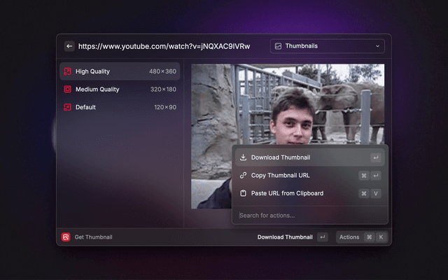 View a YouTube video's thumbnail variants, then download the images or copy their URLs.