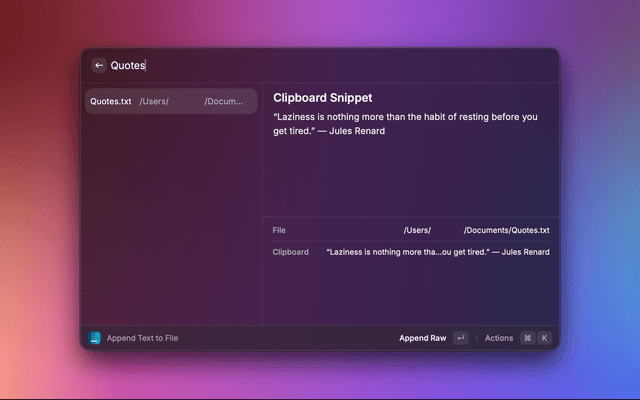 If you read something and want to save a thought immediately, this extension gives you fast, clipboard-first and text-first append workflows right inside Raycast.