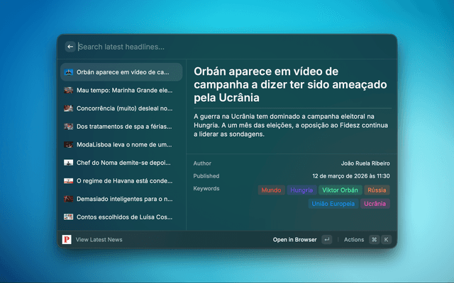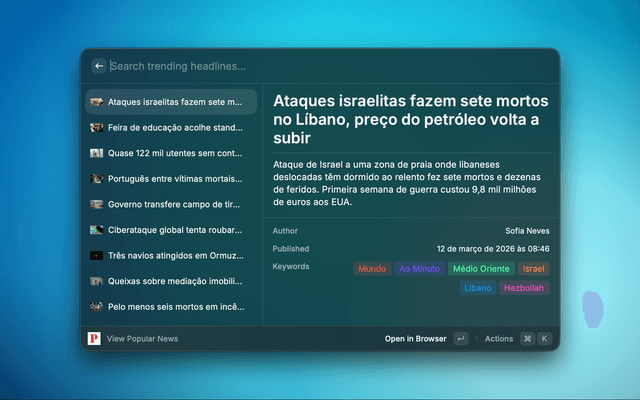 Get the latest headlines from Público without leaving Raycast. Browse the most relevant stories, keep up with breaking news, or search for articles right from your command bar.
