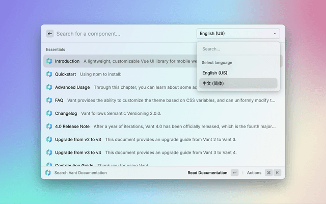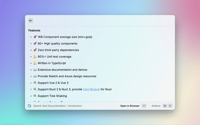 Search Vant UI library documentation in Raycast.
