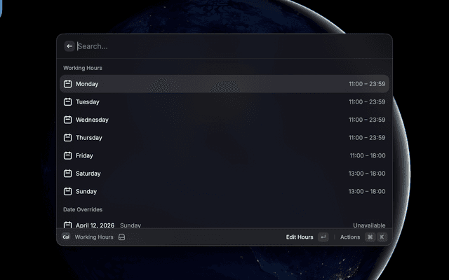 Manage your Cal.com account from Raycast — share meeting links, generate private one-time links, view and act on bookings (accept / decline / cancel / request reschedule), manage availability schedules, and schedule out-of-office entries.