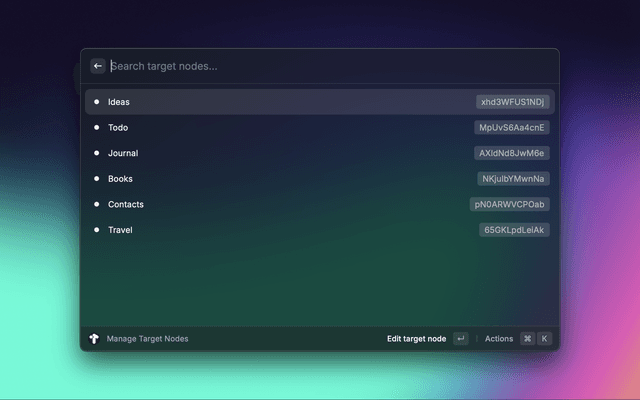 To add a target node, you'll need the node's nodeId. This can be found in Tana by pressing Cmd-K on the desired target node, and selecting Copy link. The nodeId is contained in the copied URL, however, the full URL may be pasted into the Node ID field for convenience.