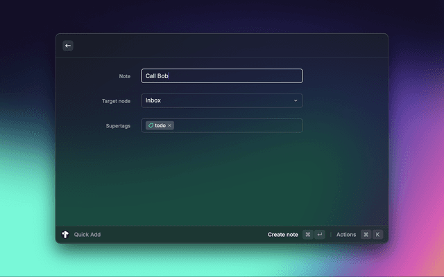 The note may be customized by adding one or more supertags, or by setting a different target node (Inbox is the default).