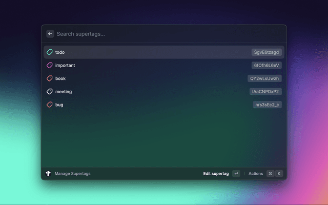 Supertags may be added to Raycast by their node ID in order to attach them to notes. This command allows you you view, add, edit or delete Supertags within Raycast.