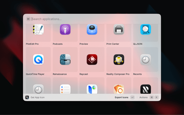 • ICNS export is not available for all apps. Some modern macOS apps use Asset Catalog icons (Assets.car) instead of traditional .icns files. PNG and JPEG export works for all apps, but ICNS export requires the original .icns file to be present in the app bundle.