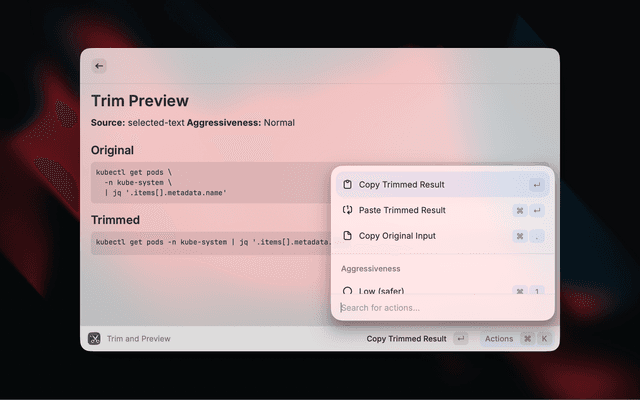 The current implementation ports the most useful Trimmy features for Raycast: