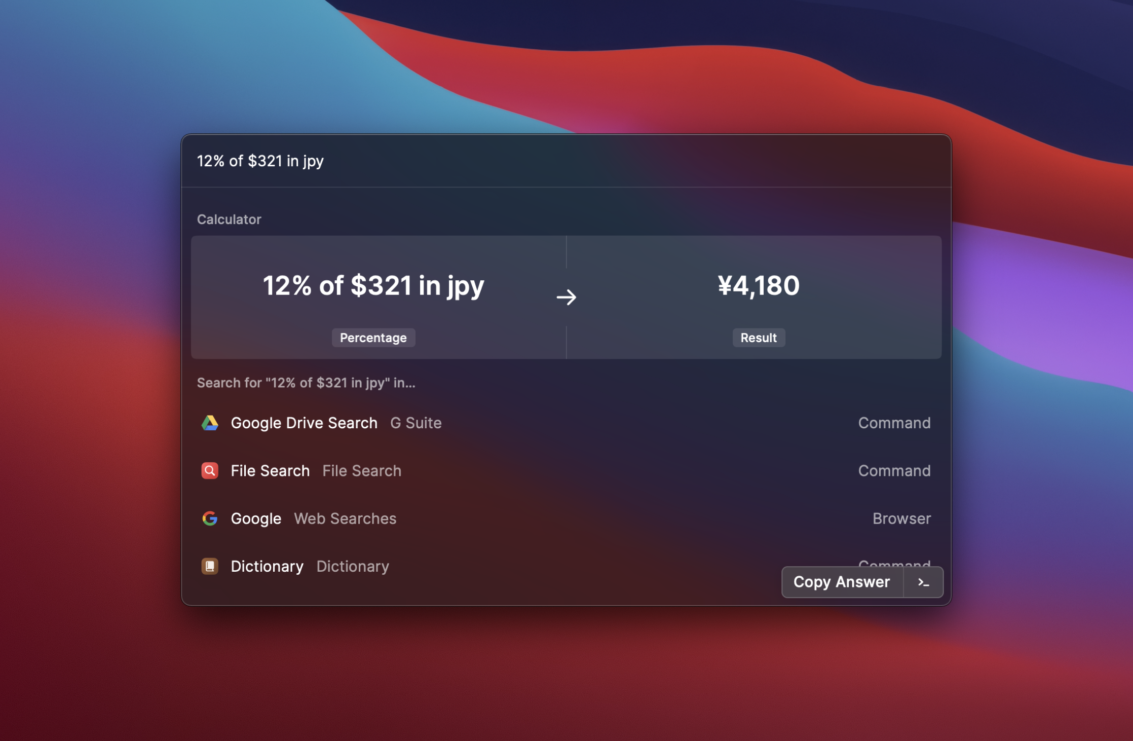 As a natural language calculator, the Raycast calculator extension is both intuitive and fast to use. This simple calculator extension makes it easy to handle a variety of calculations: