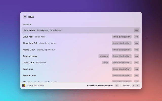 An extension to bring endoflife.date into Raycast. Get End-of-life (EOL) and support information for various products, services and frameworks.