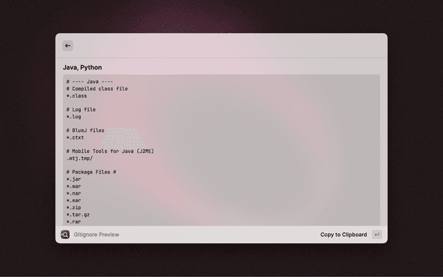 ⌘⇧P (or Ctrl + . on Windows) to add/remove templates from your favourites⌘⇧P / Ctrl + .: Toggle favourite status (Pin)⌘Y / CtrlY: Preview selected templates⌘⇧↩ / Ctrl⇧↩: Paste to active applicationTemplates are sourced from the GitHub gitignore repository.