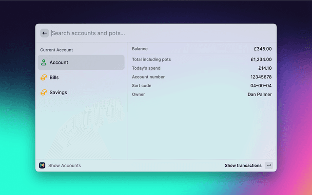 View your Monzo accounts, pots, and recent transactions.