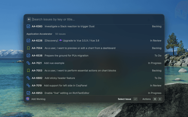 - Add Worklog: Quickly log work hours to any issue with flexible duration formats (1h, 1h30m, 2h)