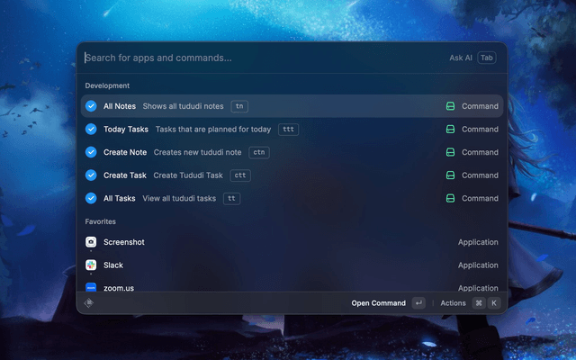 Commands Screenshot showing the available commands in the Tududi extension.