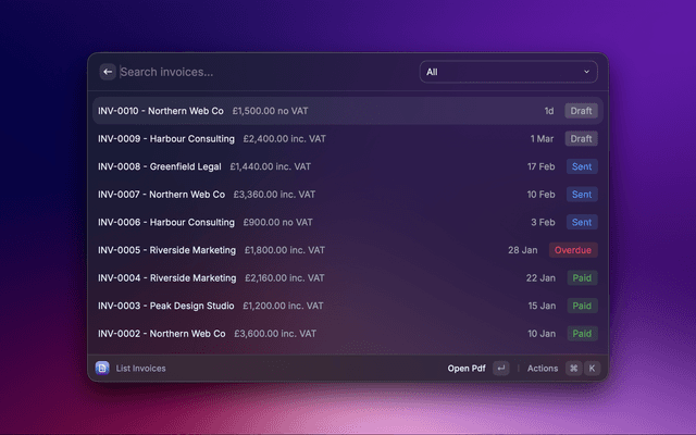 A Raycast extension for generating professional PDF invoices locally. Built for UK freelancers and small businesses using GBP.