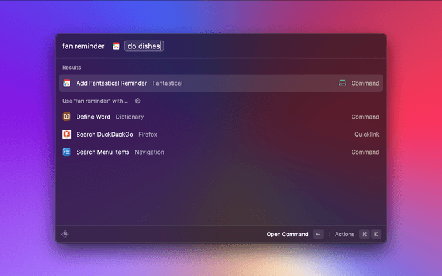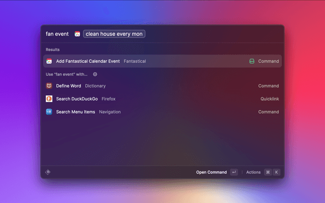 This extension utilizes Fantastical natural language processing to add events and reminders from Raycast