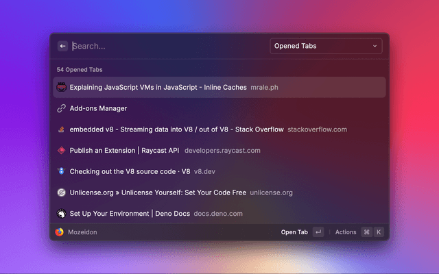 Search and open Mozilla Firefox tabs from search query, opened tabs, recently-closed tabs, and bookmarks.