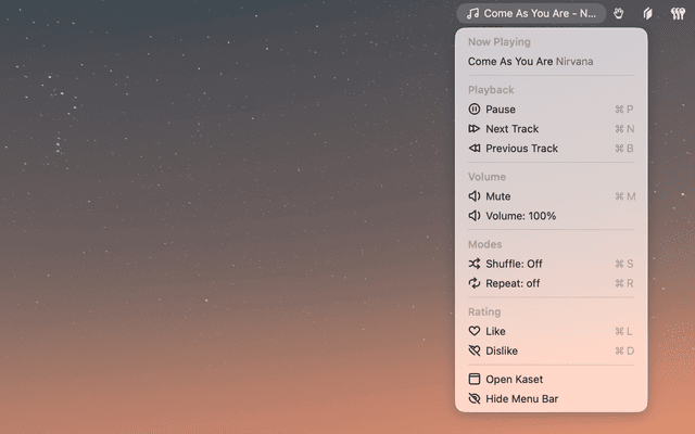The menu bar player shows the current track and provides quick access to all controls: