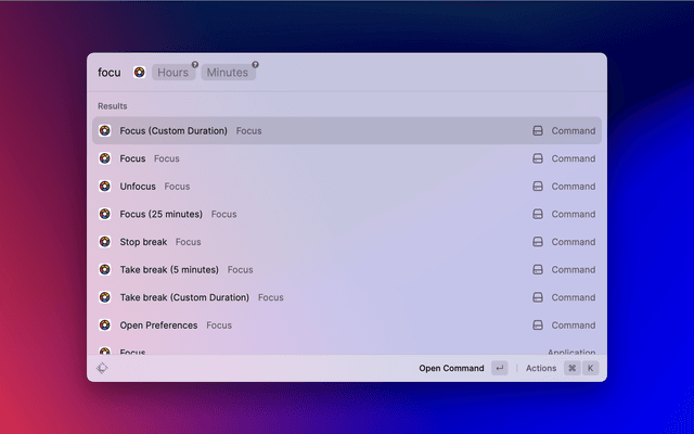 The Focus extension allows you to manage Focus app directly in Raycast.