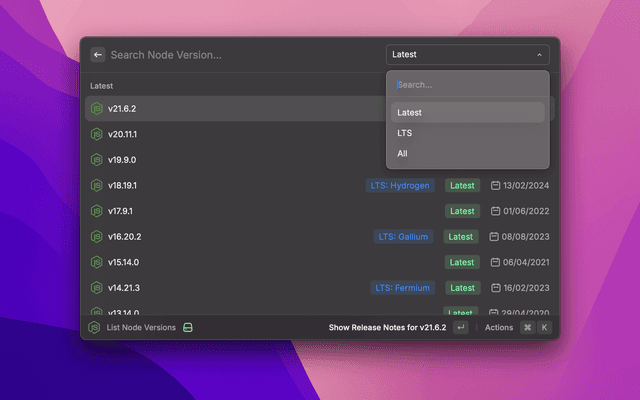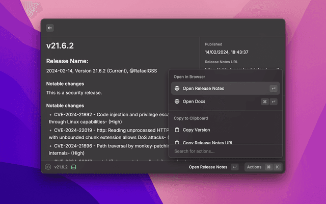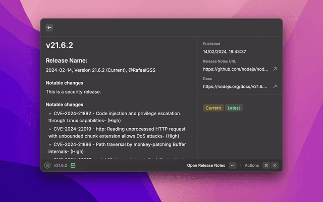 Quickly browse and access detailed information of Node.js versions. Find release notes, publication dates, and documentation links for any Node.js version. Ideal for developers and sysadmins to stay informed about Node.js updates and ensure compatibility with their projects.