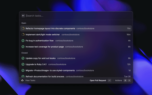• View Tasks: Track the progress of tasks you've given to Copilot, and jump to the PR or session logs in GitHub. Available as a Raycast command, and from the menu bar.
