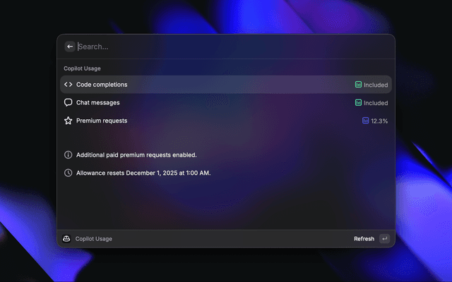 • Copilot Usage: View the remaining usage included in your GitHub Copilot subscription, including code completions, chat messages, and premium requests. Track your consumption and see when your allowance resets.