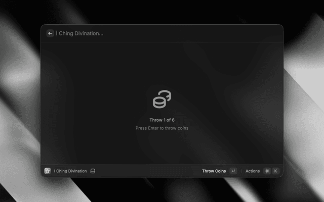 A Raycast extension for performing I Ching divination using the traditional three-coin method. Consult the Book of Changes (易經) for guidance through all 64 hexagrams.