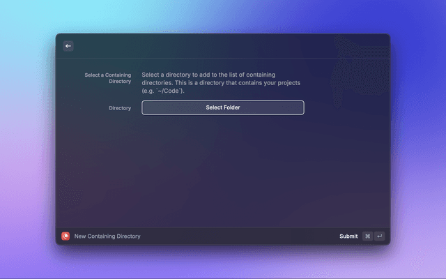 Select the New Containing Directory option, select a folder that contains your code repositories (like a ~/Projects or ~/Code folder), and submit the form.