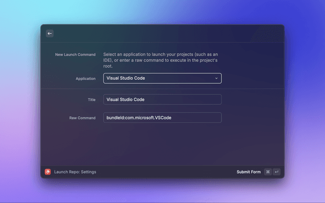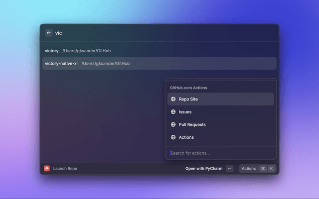 Once you've found the project you want to launch, press Enter to launch it in the first application in your "Launch Commands" list from the settings view. Or press Cmd + K to select a different application to launch it in.